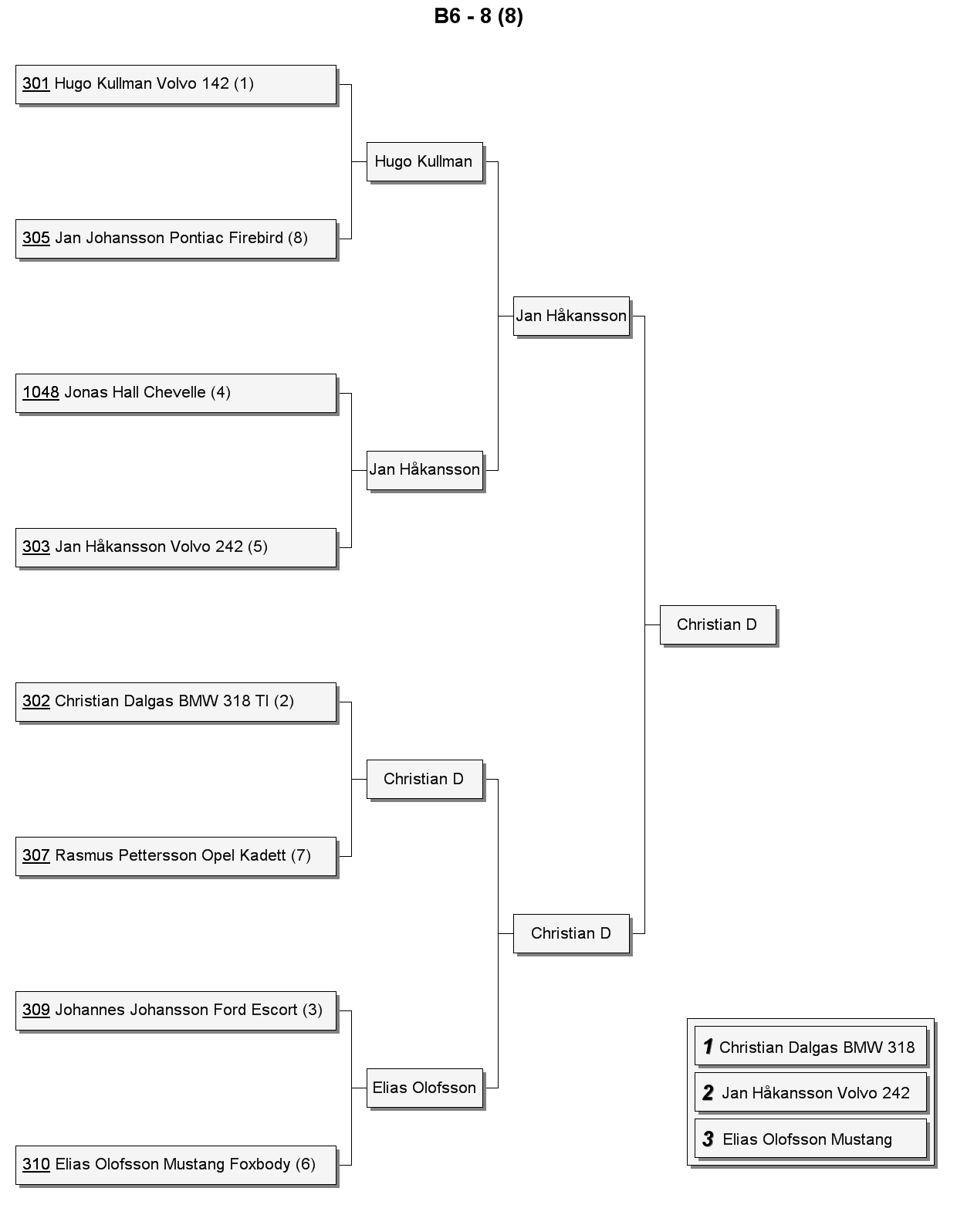| 8 | 305 | Jan Johansson | Pontiac Firebird | 6,699 | 179,6 | 1,647 | 0,272 |