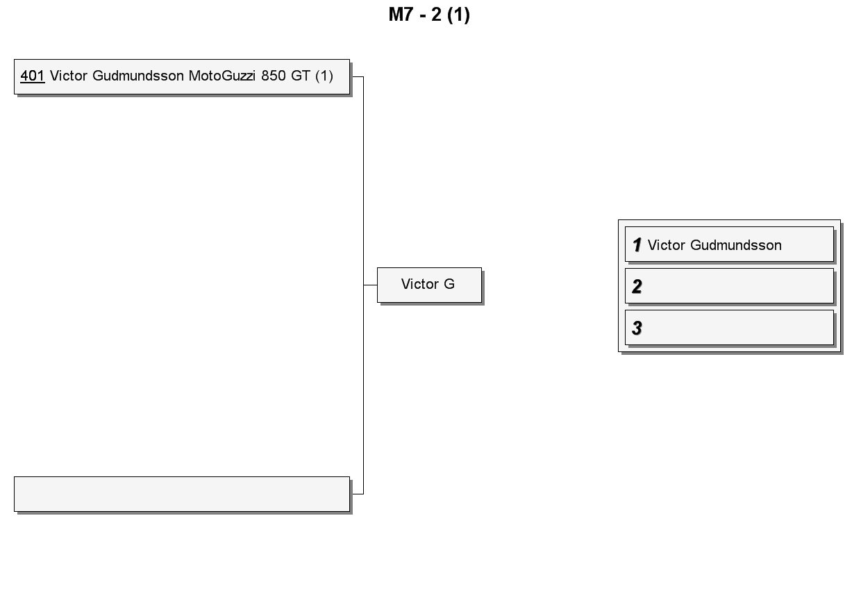 | 1 | 401 | Victor Gudmundsson | MotoGuzzi 850 GT | 10,522 | 107,3 | 2,500 | 0,700 |